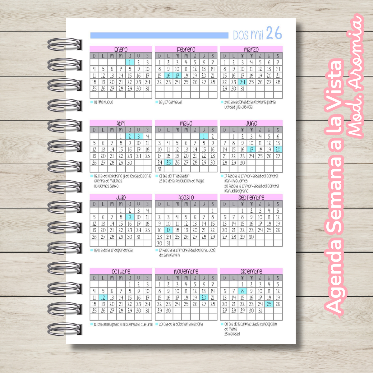160 páginas A5 (80 hojas A5 doble faz) + 12 portadas mensuales / 40 hojas A4 + portadas mensuales