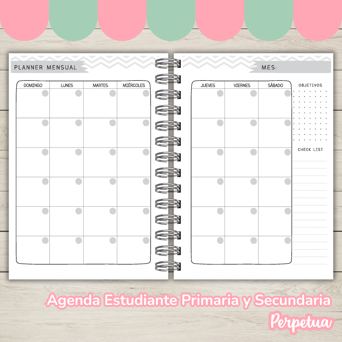 - Planner mensual perpetuo + checklist + objetivos (para 12 meses)